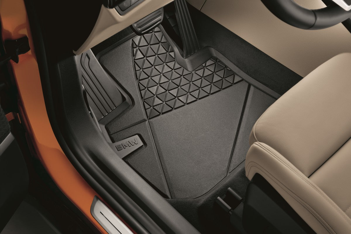 I robusti tappetini quattro stagioni BMW su misura con bordo rialzato e dal gradevole design proteggono il vano piedi posteriore e anteriore dall'umidità e dalla sporcizia. Realizzati in nero, questi tappetini si abbinano alla perfezione all’allestimento interno e sottolineano così il carattere unico della vettura.