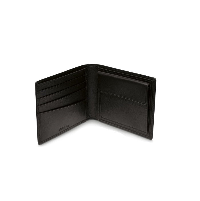 4 scomparti per carte di credito, 1 scomparto banconote, 1 scomparto per monete con bottone.